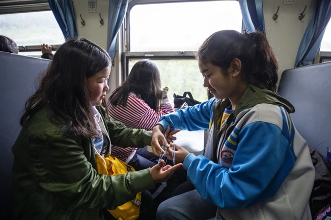 ↑在乘坐5633次列车从家返校途中,两名女生在玩翻绳(4月11日摄)。
