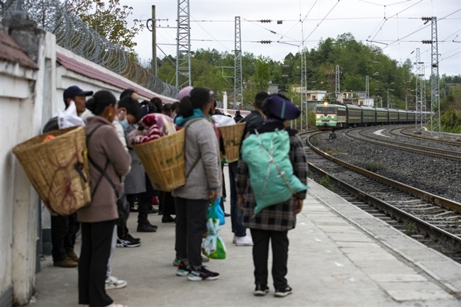 ↑在成昆铁路上普雄站,人们准备乘坐5633次列车出行(4月11日摄)。