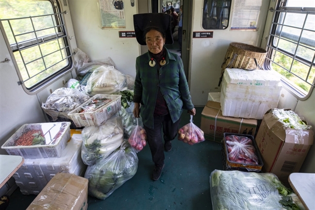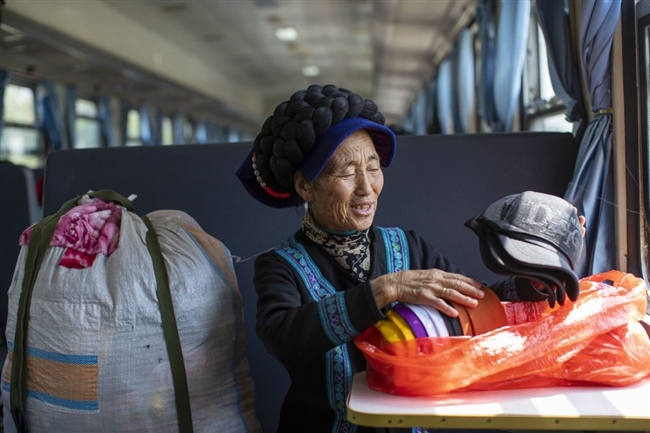 ↑在5634次列车上,75岁的彝族妇女拉衣阿呷在整理她从西昌进的货(4月12日摄)。拉衣阿呷是5633/5634次列车的常客,她每两周就要坐火车到西昌批发小商品。