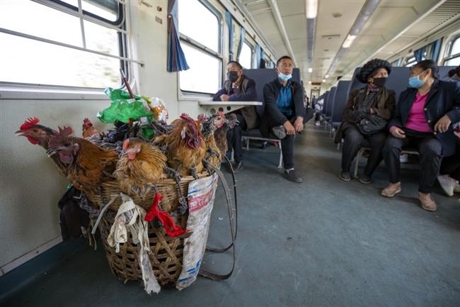 ↑5633次列车上摆放着一筐要被乘客带到西昌集市上出售的鸡(4月11日摄)。