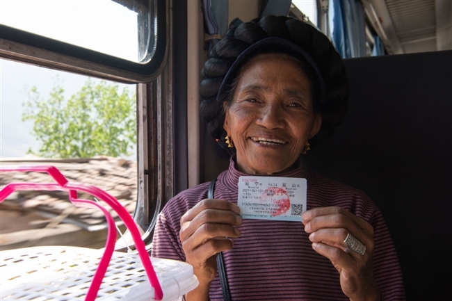 ↑在5634次列车上,越西县村民尔古阿吉木展示车票(4月12日摄)。