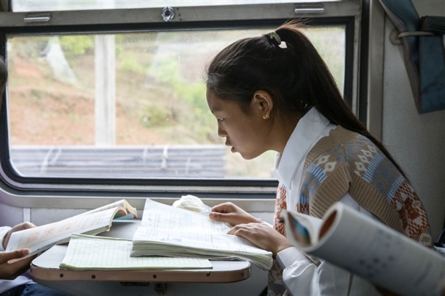↑在乘坐5633次列车从家返校途中,一名学生在复习功课(4月11日摄)。