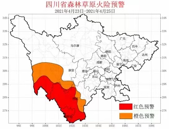 据林草部门预报,4月23日—25日上述地区森林草原火险等级可达4~5级。经综合研判气象条件、林区物候、野外火源及火灾发生情况,预计4月23日—4月25日,上述地区森林草原火险等级将维持在高度及以上危险级别,防火形势十分严峻,特发布高森林草原火险预警。上述区域中甘孜州西南部、凉山州西部南部、攀枝花全境为红色预警,其余地区为橙色预警。