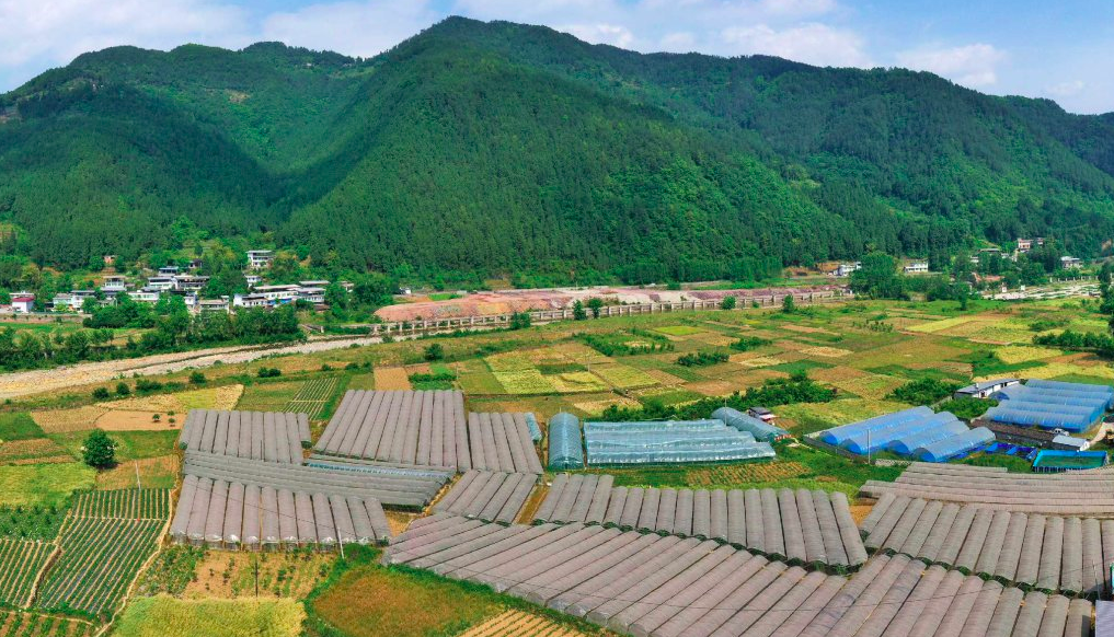 5月7日,巴中市南江县公山镇流坝村,绿意盎然的田园与错落的民居、秀丽的山峦相映成趣
