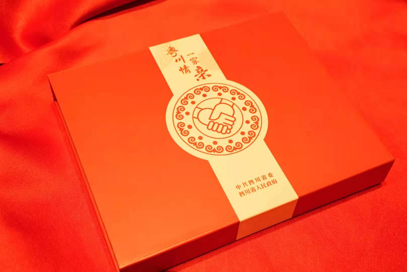 “粤川情 一家亲”,几个饱含温度的大字和一张心手相连的图片被深深印在红色的礼盒上,处处书写着粤川人民的深情厚谊。而这里面装的东西,正承载了山海万里粤川情。