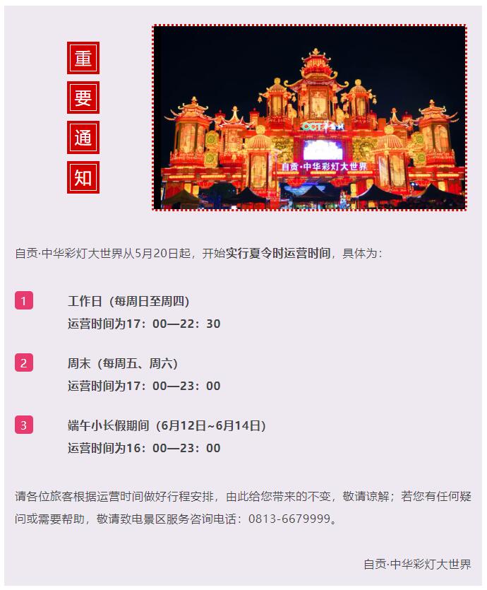 对此,自贡·中华彩灯大世界希望各位游客根据运营时间做好行程安排,由此带来的不变敬请谅解;若有任何疑问或需要帮助,可以致电景区服务咨询电话:0813-6679999。