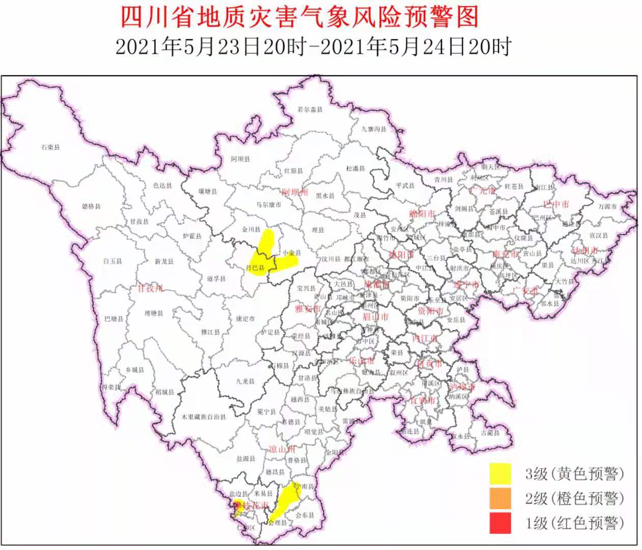 时间:2021-05-24 07:47:27 来源:四川观察5月23日,四川省地质灾害指挥部办公室结合四川省气象台天气预报情况,发布地质灾害气象风险预警:5月23日20时~5月24日20时,全省地质灾害气象风险预警为3级、黄色预警。