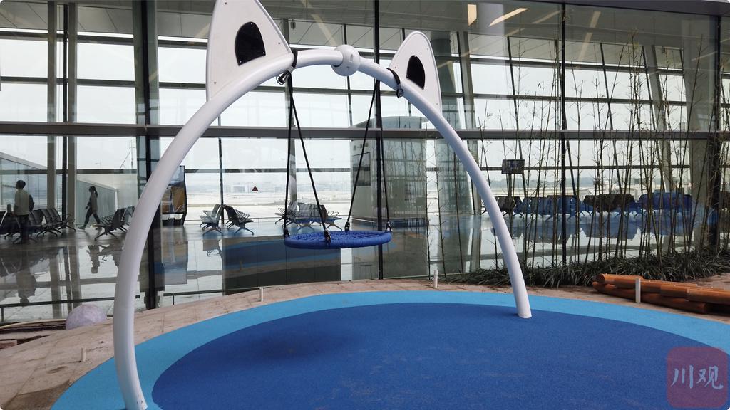 还有为儿童设置的开放式庭院。T2航站楼的“乐园”以熊猫为主题,设有卡通造型的秋千、山洞等玩乐装置,并配有抗摔的塑胶地面做保护。在展现全世界闻名的大熊猫的同时,给孩子们提供了一个可以嬉戏的活动场所。