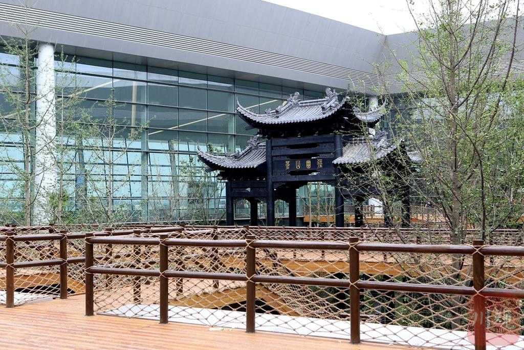 T2航站楼内的核心庭院,则再现了青城山的美景,题有“苍山幽径”的牌坊,掩映在参天大树之间。这座庭院是可参与性的,旅客可走到庭院中,沿着古蜀栈道“曲径通幽”,犹如置身深山,感受幽深青翠、静谧苍茫。