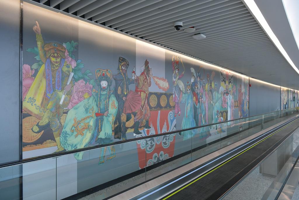 工作人员介绍,作为西部最大的国际枢纽机场,天府国际机场就是一扇独特的“窗口”,T1航站楼主营国际(地区)航线,因此选择在这里,用10余幅巨大的墙面艺术作品,尽情呈现了四川的自然风光、人文历史、休闲生活等,将川剧、蜀绣等非遗项目巧妙地融合,把成都的“韵味”展现得淋漓尽致。