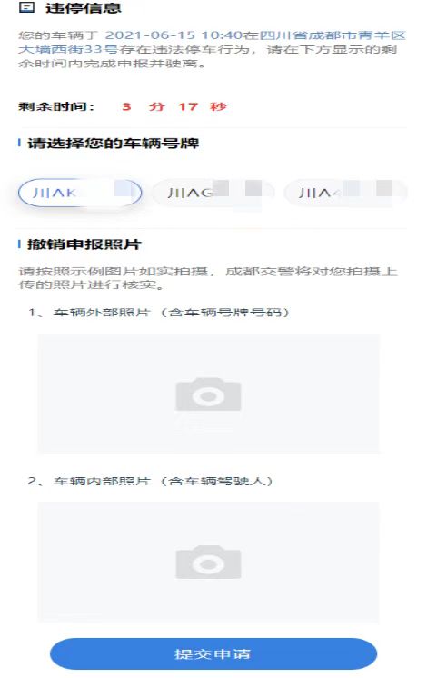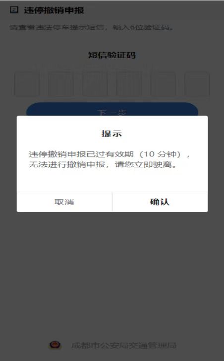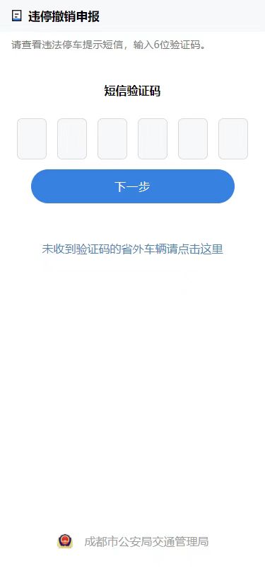当事人在规定时限内,根据短信提醒或违停告知单的提示说明,进入“蓉e行”中“违停消除申报”模块,输入短信验证码,拍照上传违法纠正证明照片。