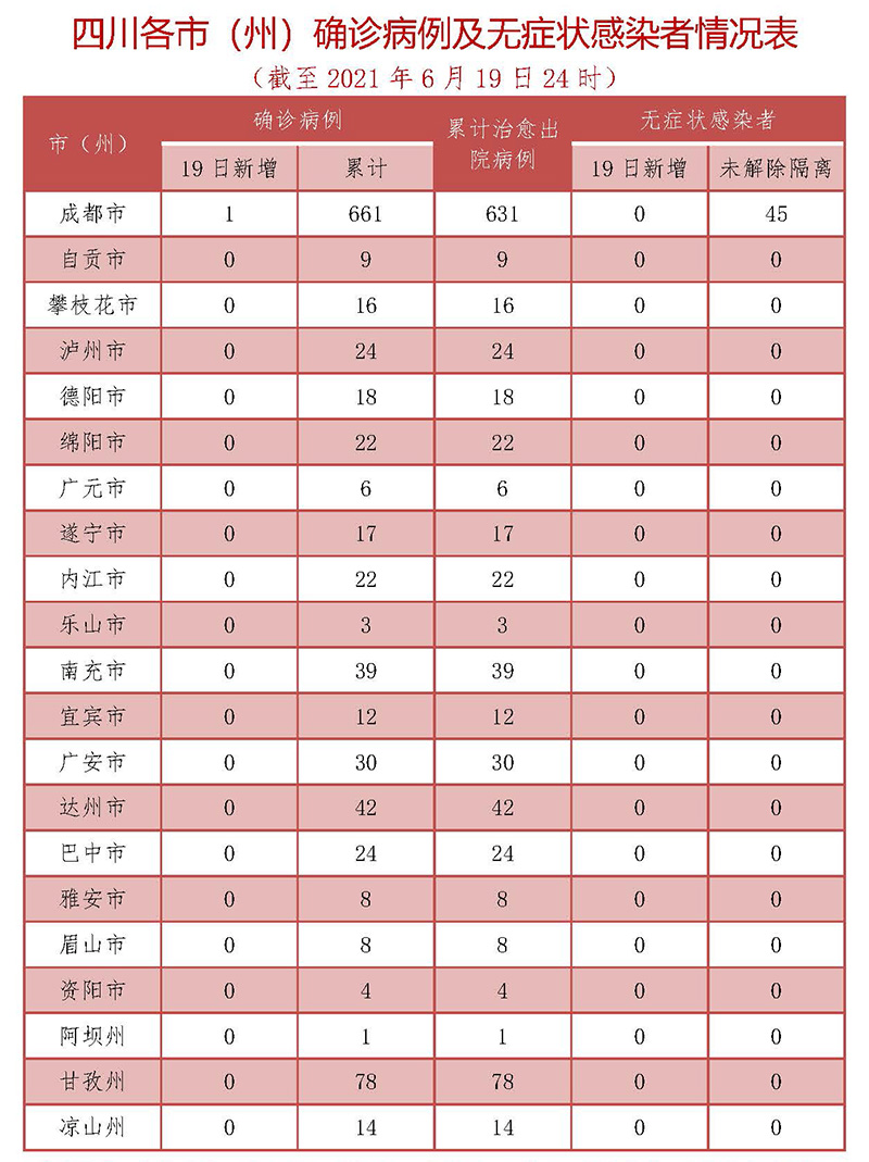 时间:2021-06-20 09:02:06 来源:健康四川6月19日0-24时,四川新增1例新型冠状病毒肺炎确诊病例(境外输入,为6月18日无症状感染者转确诊),无新增治愈出院病例,无新增疑似病例,无新增死亡病例。