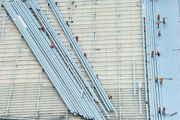 2020年5月22日,工人在安装T1航站楼外顶棚。