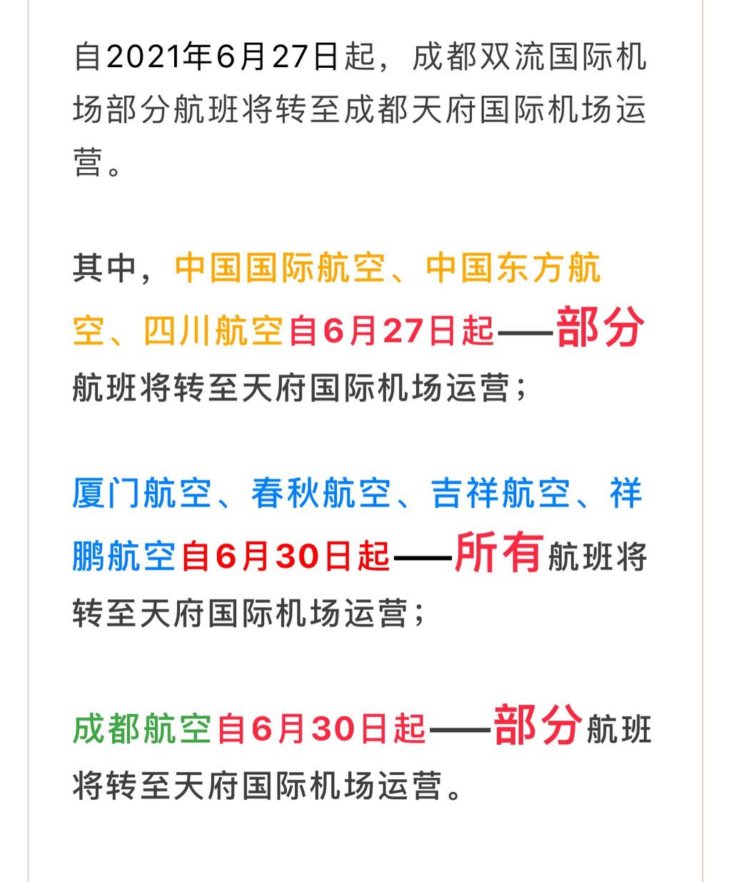时间:2021-06-24 15:47:11 来源:川观新闻6月24日,成都双流国际机场官方微信发布重要提示:自2021年6月27日起,成都双流国际机场部分航班将转至成都天府国际机场运营。请旅客出行务必提前确定出发及到达机场信息。