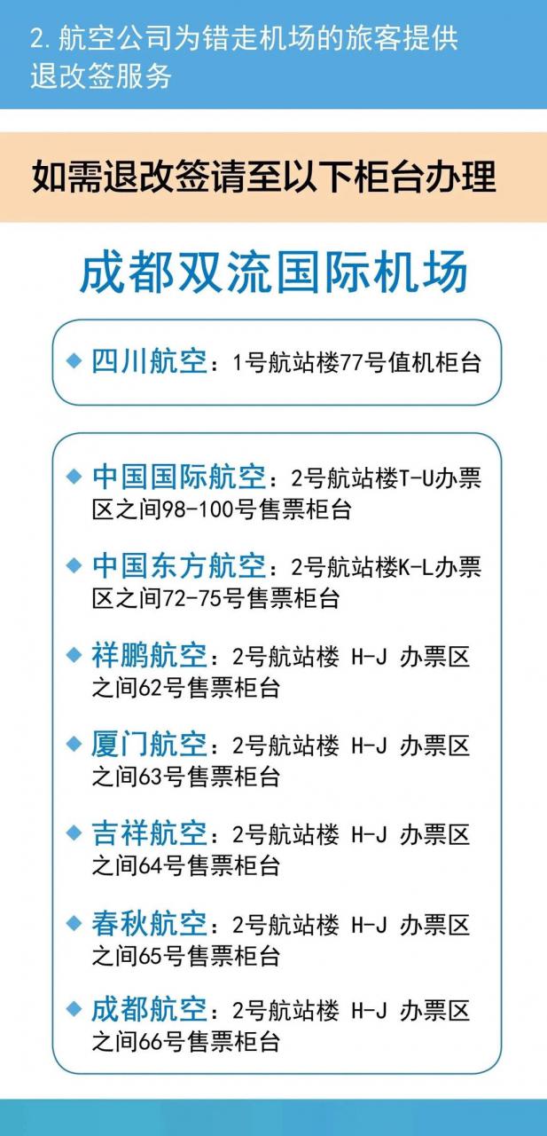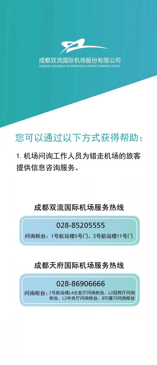 如果走错机场,您也不必担心。双流国际机场、天府国际机场联合各航空公司共同为天府机场投运转场初期错走机场的旅客制定了服务保障措施。