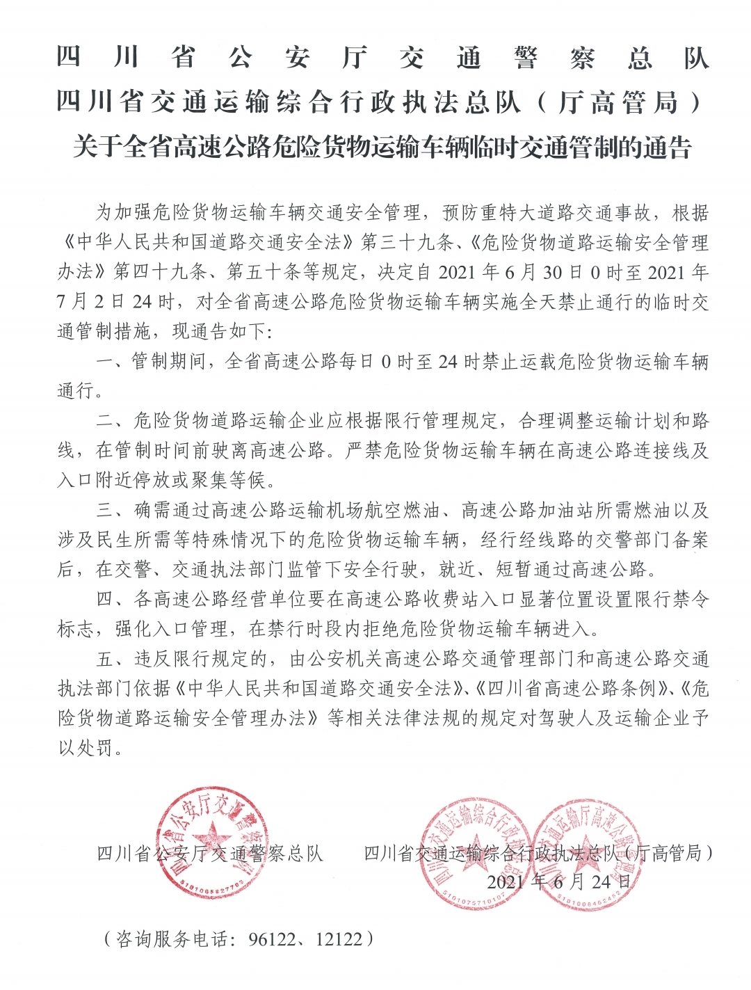 为加强危险货物运输车辆交通安全管理,预防重特大道路交通事故,根据《中华人民共和国道路交通安全法》第三十九条、《危险货物道路运输安全管理办法》第四十九条、第五十条等规定,决定自2021年6月30日0时至2021年7月2日24时,对全省高速公路危险货物运输车辆实施全天禁止通行的临时交通管制措施,现通告如下: