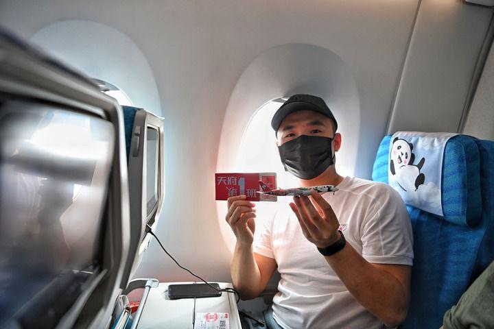 6月27日,在成都天府国际机场,四川航空公司工作人员展示首航纪念登机牌。新华社记者 王曦 摄