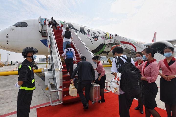 6月27日,在成都天府国际机场,搭乘四川航空公司3U8001航班的旅客陆续登机,这是该机场投入使用后首个航班。新华社记者 王曦 摄