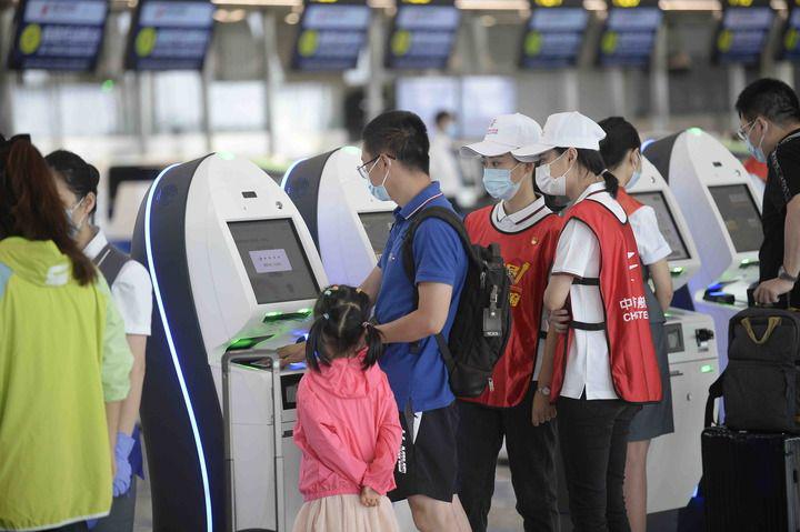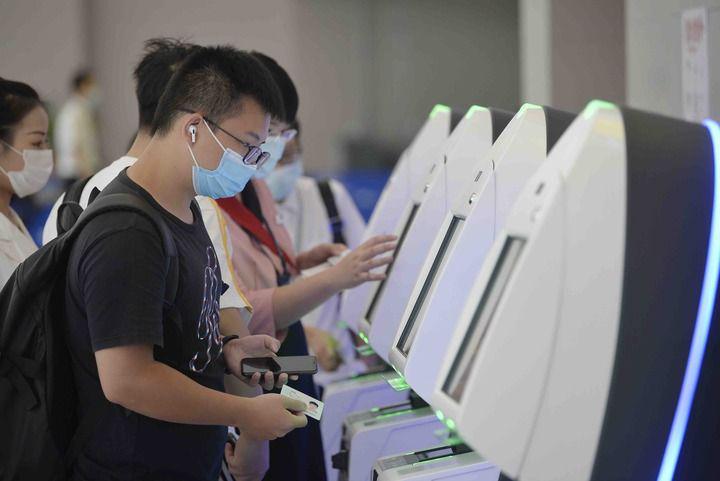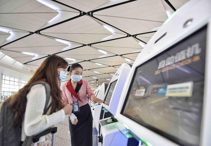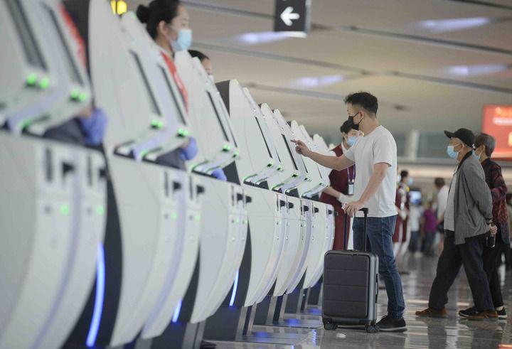 6月27日,旅客在成都天府国际机场T2航站楼办理自助值机。新华社记者 刘坤 摄