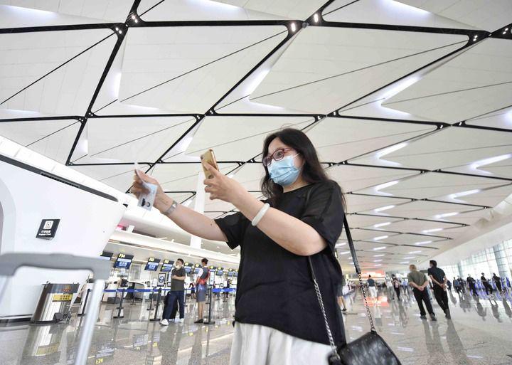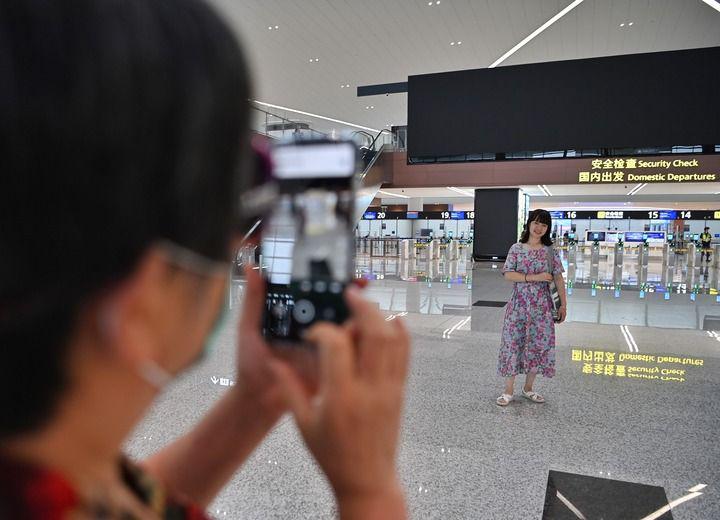 6月27日,在成都天府国际机场,旅客在国内出发入口留影。新华社记者 王曦 摄
