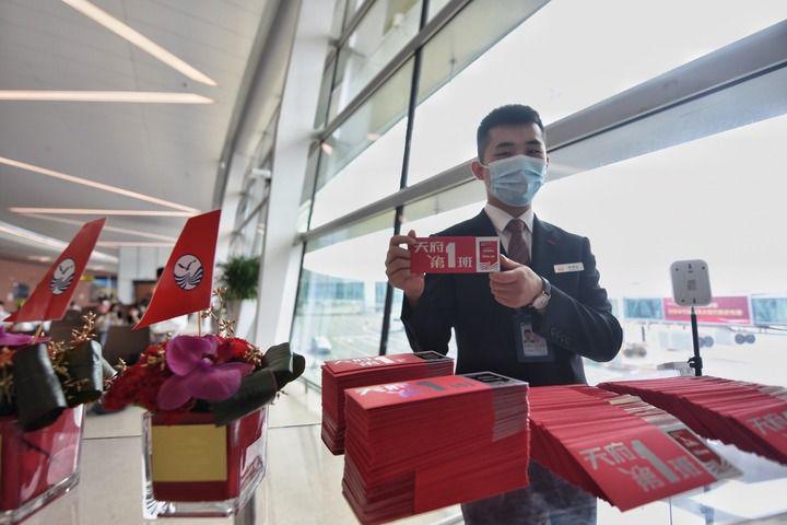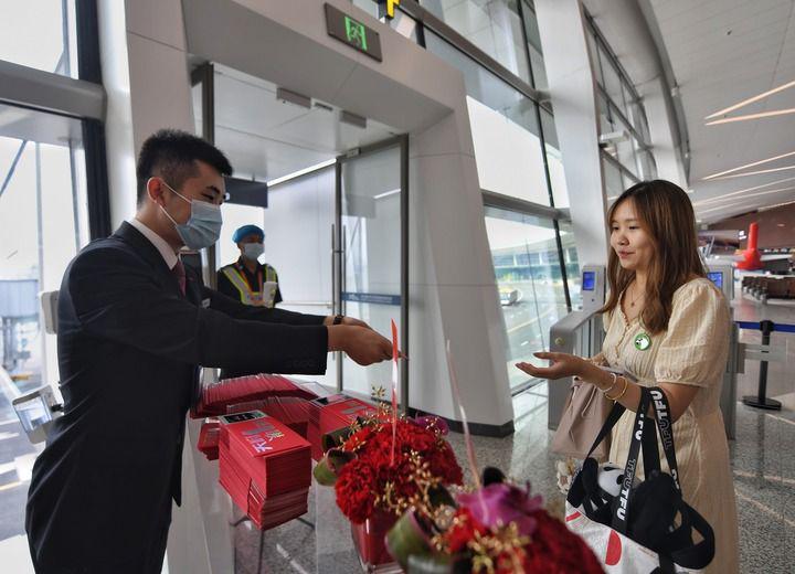 6月27日,在成都天府国际机场,工作人员向搭乘首航航班的旅客赠送纪念登机牌。新华社记者 王曦 摄