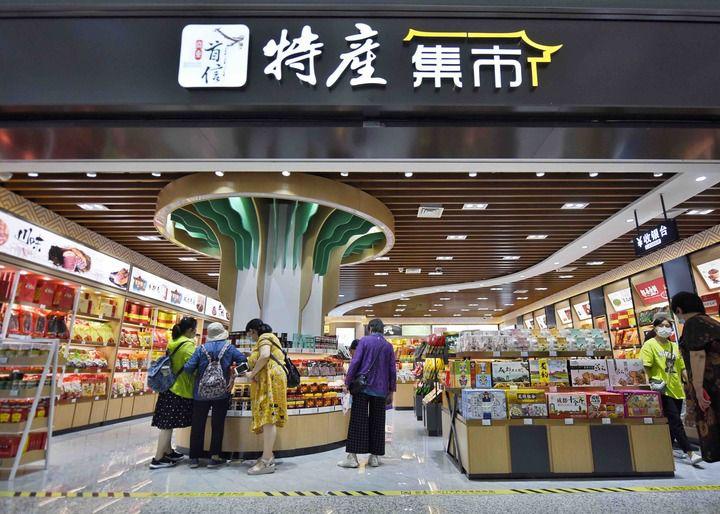 6月27日,旅客在成都天府国际机场T2航站楼内的特产集市选购商品。新华社记者 刘坤 摄