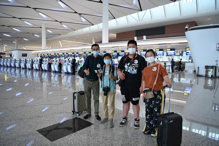 6月27日,在成都天府国际机场,旅客在出发大厅合影留念。新华社记者 王曦 摄