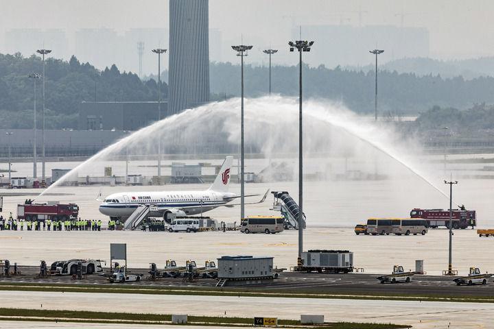 6月27日,中国国际航空公司飞往上海浦东国际机场的CA1948航班在成都天府国际机场准备起飞。新华社记者 沈伯韩 摄