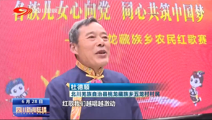 北川羌族自治县桃龙藏族乡五龙村村民 杜德顺:红歌我们越唱越激动,它唱出了我们的心声,(现在)水泥路修到我们的家门口,病了有新农合,生活得到了大改善,没有共产党就没有我们现在的新生活。