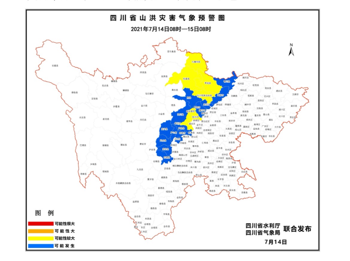 时间:2021-07-14 12:44:47 来源:四川观察 川观新闻7月14日10时,四川省水利厅、四川省气象局联合发布山洪灾害黄色预警,14日8时至15日8时,平武、北川、安州、 九寨沟、松潘、都江堰、彭州、崇州等县(市、区)发生山洪灾害可能性较大(蓝色);江油、青川、绵竹、什邡、大邑、蒲江、邛崃、汉源、石棉、芦山、宝兴、荥经、天全、汶川、茂县等县(市、区)可能发生山洪灾害(蓝色)。