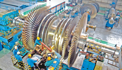 ▲东方汽轮机有限公司的生产车间内,正在加工百万千瓦核电转子。