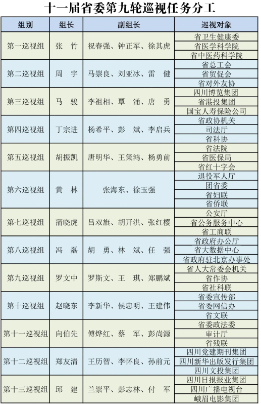会议明确,省委第九轮巡视将派出13个巡视组对省法院、省人大常委会机关、省政府办公厅、省政协机关、省委宣传部、省委政法委、省委网信办、省公务服务中心、公安厅、司法厅、省卫生健康委、退役军人厅、审计厅、省医保局、省大数据中心、省政府驻北京办事处、省总工会、团省委、省妇联、省文联、省作协、省科协、省社科联、省工商联、省贸促会、省残联、省对外友协、省侨联、省红十字会、四川日报报业集团、四川广播电视台、四川党建期刊集团等32个省直部门(单位),四川博览集团、省港投集团、四川新华出版发行集团、四川文投集团、峨眉电影集团、国宝人寿保险公司等6户省管企业,以及省中医药科学院、省医学科学院2所科研单位开展常规巡视。各巡视组拟于8月下旬进驻被巡视党组织。