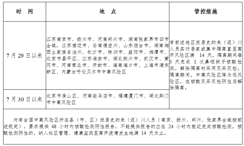 国内中高风险地区来(返)川人员管理措施