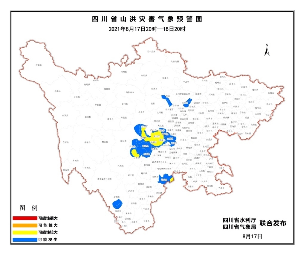 时间:2021-08-18 11:22:23 来源:四川在线8月17日18时,四川省水利厅、四川省气象局联合发布山洪灾害黄色预警。8月17日20时至18日20时,泸定、雨城、石棉、名山、芦山、天全、宝兴、雷波、丹棱、邛崃、蒲江等县(市、区)发生山洪灾害可能性较大;汶川、理县、茂县、安州、北川、康定、东坡、洪雅、青神、盐源、盐边等县(市、区)可能发生山洪灾害。