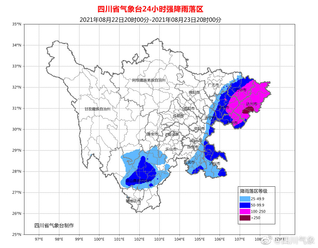 22日20时到23日20时,达州、广安、巴中、南充4市和遂宁市东部有暴雨(雨量60~80毫米),局部地方有大暴雨(雨量160~200毫米),个别特大暴雨(雨量250~270毫米),并伴有雷电和短时阵性大风;凉山州、泸州有大雨到暴雨(雨量30~80毫米),个别大暴雨。