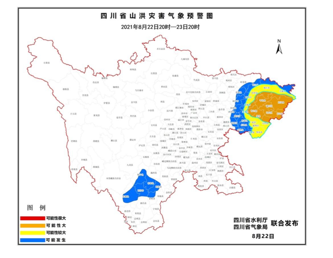 时间:2021-08-22 17:48:47 来源:四川观察8月22日17时,四川省水利厅联合四川省气象局发布山洪灾害橙色预警,22日20时至23日20时,通川、达川、宣汉、开江、万源、大竹、渠县、巴州、平昌、通江、仪陇、营山等县(市、区)发生山洪灾害可能性大(橙色);广安、前锋、邻水、华蓥、恩阳、南江、蓬安等县(市、区)发生山洪灾害可能性较大(黄色);西昌、冕宁、盐源、喜德、昭觉、普格、武胜、岳池、嘉陵、高坪、顺庆、西充、南部、阆中、苍溪、旺苍等县(市、区)可能发生山洪灾害(蓝色)。