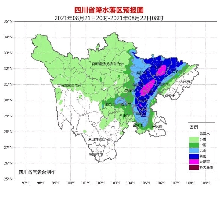 根据气象部门预报,8月21日20时到22日20时,广元、巴中、南充、遂宁、资阳、内江、自贡、眉山8市和绵阳、德阳、成都、雅安4市东部及宜宾市北部有暴雨(雨量60-80毫.米),局部地方有大暴雨(雨量160-200毫米),并伴有雷电和短时阵性大风。