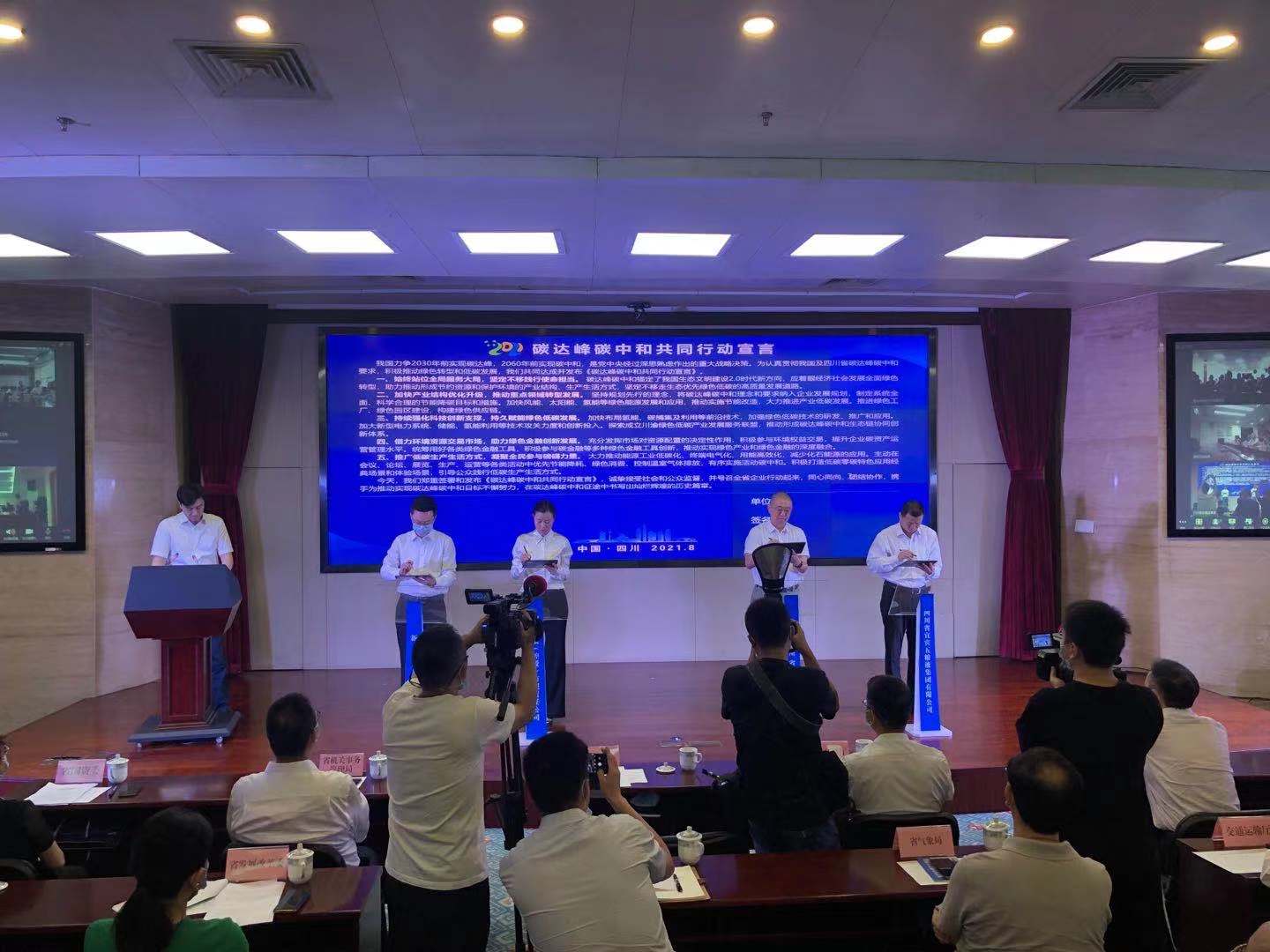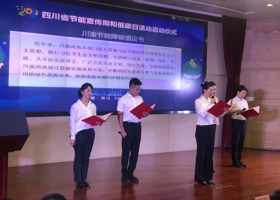 启动仪式上,国网四川省电力公司、四川发展控股有限责任公司、四川省宜宾五粮液集团有限公司、新希望集团等企业代表签署了《碳达峰碳中和共同行动宣言》;四川省节能监管事务中心负责同志代表川渝节能监管事务机构,向企业代表、机关事业单位代表、医院代表、学校代表以及社区代表颁发川渝节能减碳倡议书,国有企业代表四川省生态环保产业集团负责人领读倡议书;碳中和服务平台运营方四川联合环境交易所,向本次活动主办方代表颁发了本次会议的碳中和证书。