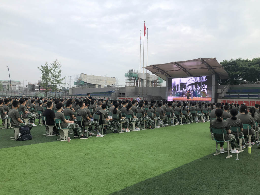 成都七中万达学校初一年级同学在操场观看开学第一课。