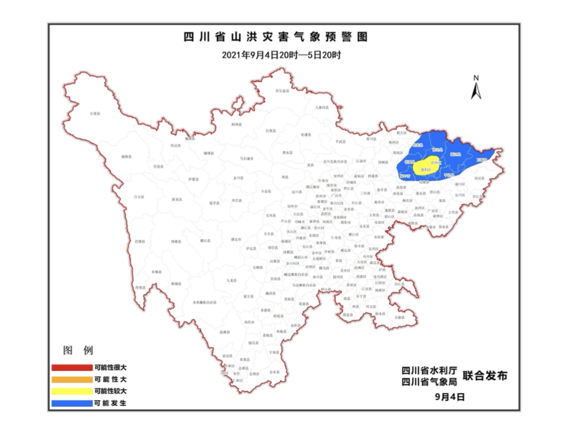 时间:2021-09-04 18:24:42 来源:四川观察9月4日17时,四川省水利厅、四川省气象局发布山洪灾害黄色预警,4日20时至5日20时,巴州、恩阳、南江、阆中、仪陇、苍溪等县(市、区)发生山洪灾害可能性较大(黄色);旺苍、通江、平昌、万源等县(市、区)可能发生山洪灾害(蓝色)。