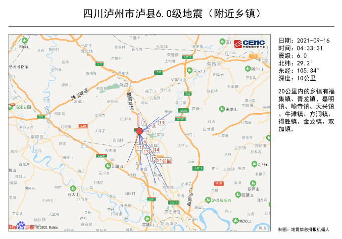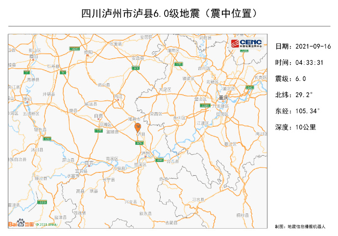 时间:2021-09-16 05:50:25 来源:泸州应急管理中国地震台网正式测定:09月16日04时33分在四川泸州市泸县((北纬29.20度,东经105.34度)发生6.0级地震,震源深度10千米。泸州市已启动一级应急响应。