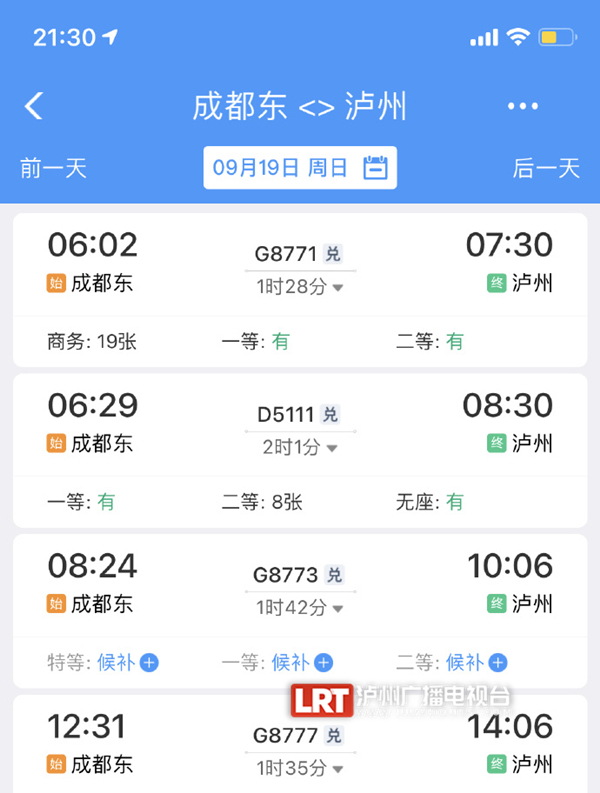 目前,通过12306手机客户端已可查询9月19日及以后绵泸高铁的相关车次。