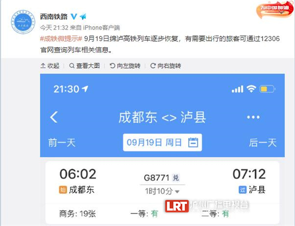 9月18日晚间,中国铁路成都局集团有限公司通过官方微博“西南铁路”发布消息:9月19日绵泸高铁列车逐步恢复,有需要出行的旅客可通过12306官网查询列车相关信息。