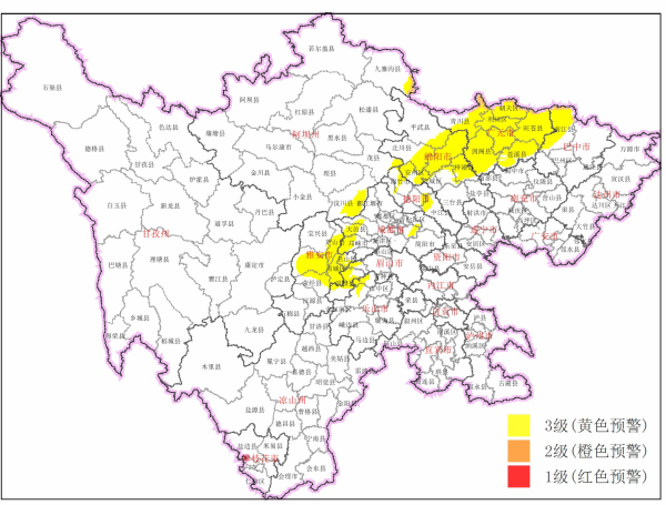 3级黄色预警区域为成都龙泉驿区、青白江区、崇州市、邛崃市、大邑县,德阳旌阳区、罗江区、绵竹市、什邡市、中江县,绵阳安州区、涪城区、游仙区、江油市、平武县、梓潼县、北川县,广元利州区、朝天区、昭化区、旺苍县、青川县、剑阁县、苍溪县,乐山峨眉山市、夹江县,巴中南江县,雅安名山区、雨城区、荥经县、天全县、芦山县、宝兴县,眉山洪雅县、丹棱县,阿坝州汶川县、茂县、九寨沟县等9市(州)38个县(市、区)。