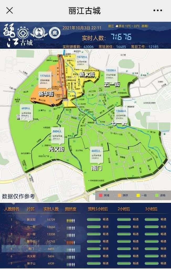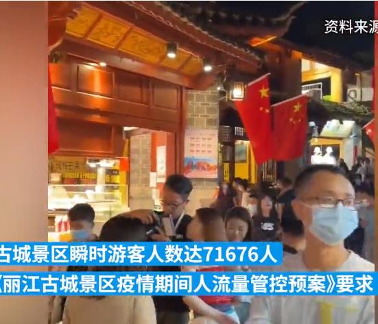 10月3日晚,丽江古城保护管理局发布微博称:10月3日22时11分,丽江古城瞬时游客人数达71676人。