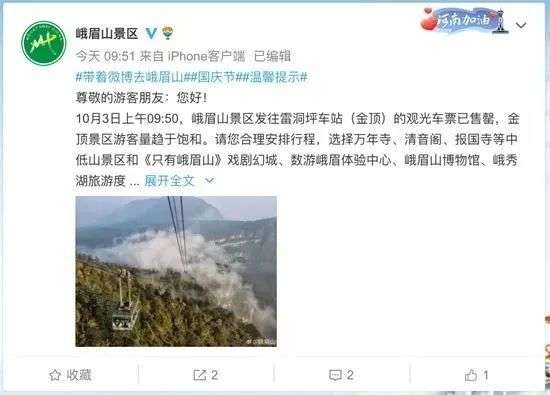 据峨眉山景区官方微博消息,10月3日上午不到10点峨眉山景区发往雷洞坪车站(金顶)的观光车票已售罄,金顶景区游客量趋于饱和。景区请大家合理安排行程,选择万年寺、清音阁、报国寺等中低山景区和《只有峨眉山》戏剧幻城、数游峨眉体验中心、峨眉山博物馆、峨秀湖旅游度假区等周边景区错峰游览。