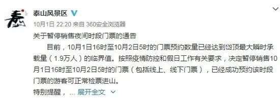 山东泰安的泰山风景区,10月1日晚10点多发布消息,决定暂停销售1日16时至2日5时的门票(包括线上、线下门票)。已经成功预约该时段门票的游客,可正常检票进山。