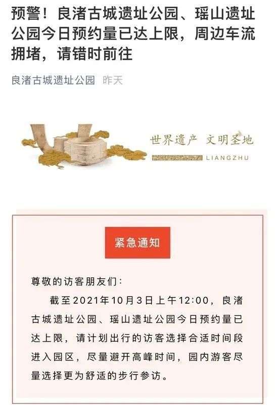 10月3日上午,良渚古城遗址公园公号发布预警:截至当日上午12点,良渚古城遗址公园、瑶山遗址公园今日预约量已达上限,请计划出行的访客选择合适时间段进入园区,尽量避开高峰时间,园内游客尽量选择更为舒适的步行参访。