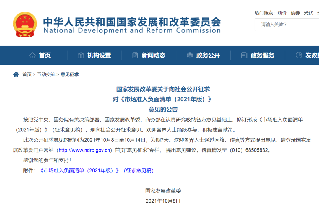 时间:2021-10-09 08:15:21 来源:国家发改委网站10月8日,国家发改委就《市场准入负面清单(2021年版)》向社会公开征求意见。征求意见稿提到,禁止违规开展新闻传媒相关业务。