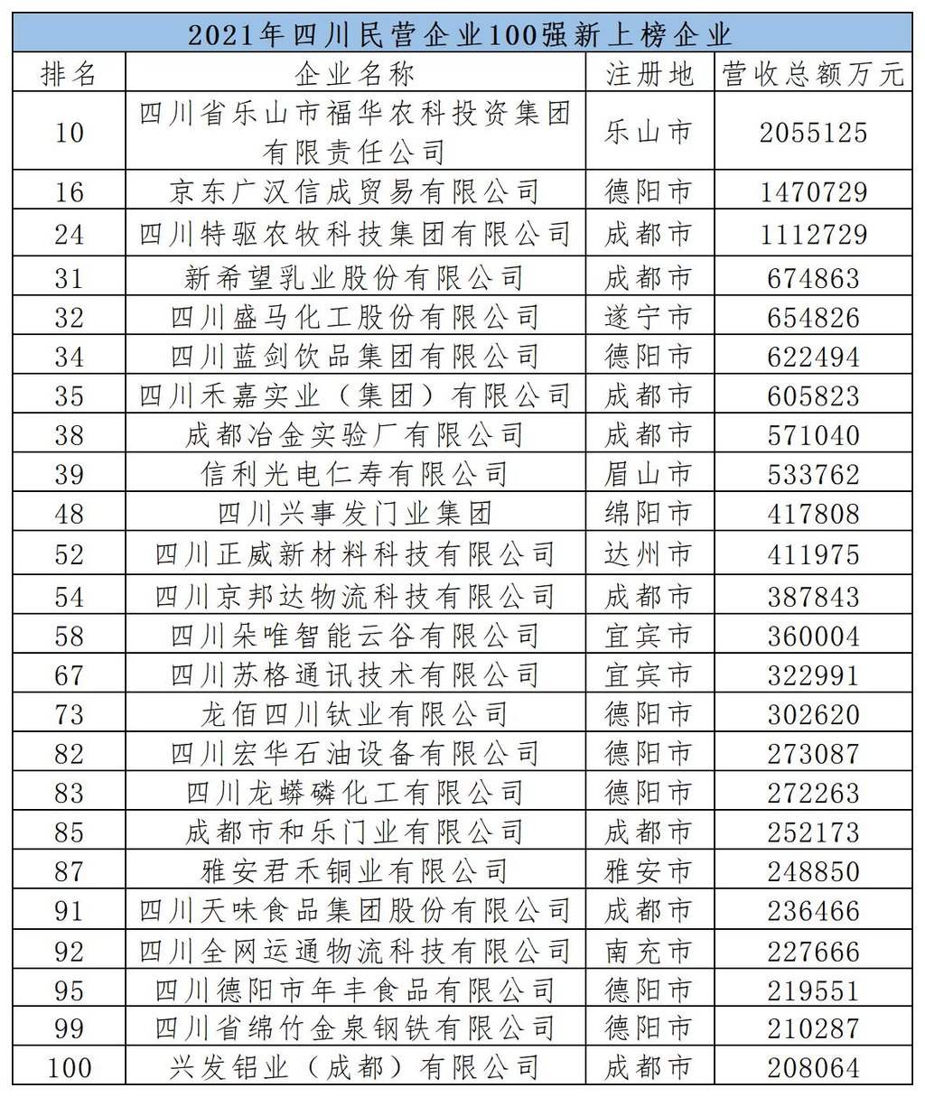 根据榜单显示,今年四川民营企业100强入围门槛实现新的突破,达20.81亿元,比上年增加3.66亿元、同比增长21.34%。大中型企业数量稳步提升,营业收入超过100亿元28家企业,比上年增加2家。其中,新希望集团以2180.80亿元位列营业收入第1名,通威集团、蓝润集团分别以926.35亿元和710.00亿元位列营收第二、三名。